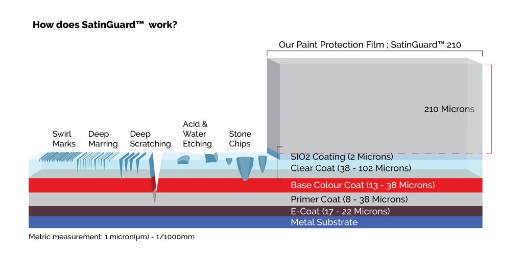 SatinGuard™’s sophisticated self-reconverging technology ensures worry-free ownership as the advance paint protection film system as it will “heal” itself from swirl marks and light scratches as you drive.