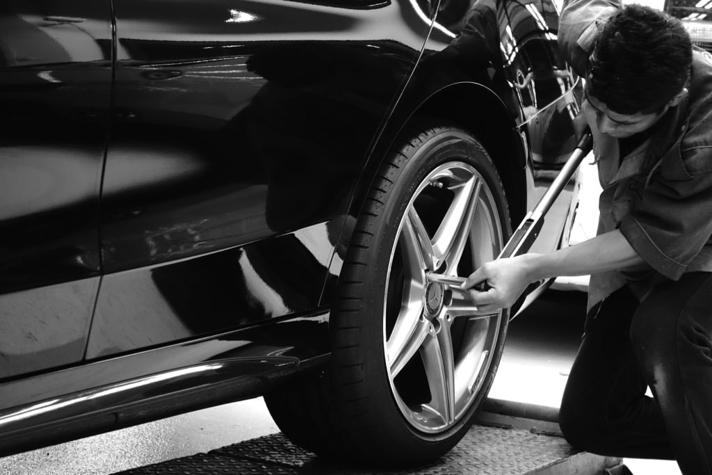As part of our extensive detailing experience, we’ve worked on numerous vehicles both conventional, vintage and exotic. However, our attention to detail extends past just cosmetic elements at our studio. As part of our recent series of black & white unedited photo series; here one of our technicians is fitting back the wheels on a just detailed latest generation Mercedes C-Class.