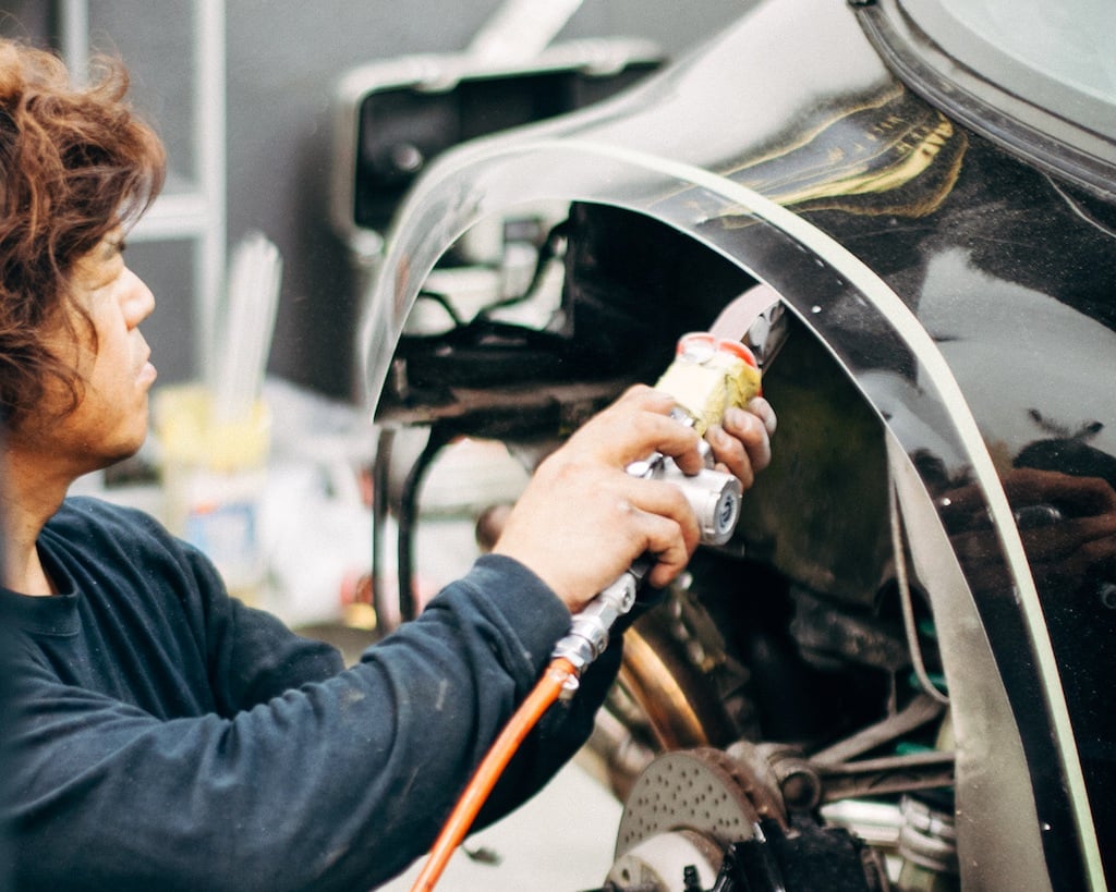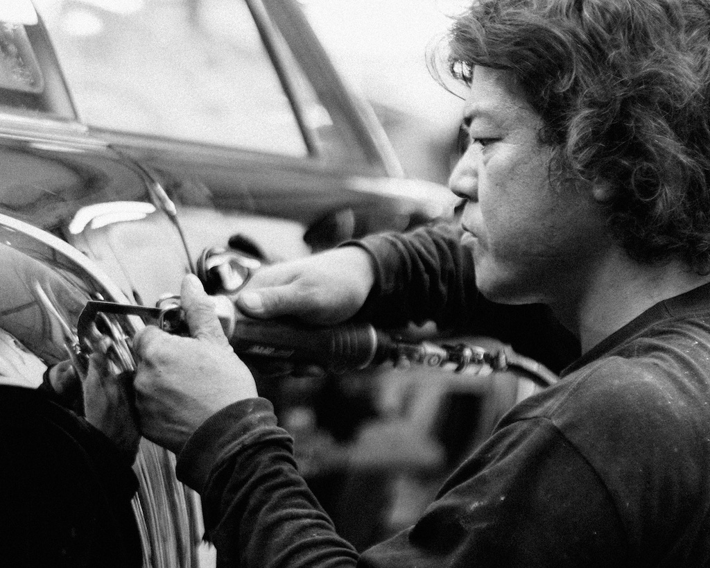 Using a handheld sander, Nakai San finishes off the grinding and smoothing out of all cuts before he begins fitting the new fibre-reinforced polymer wheel arches.