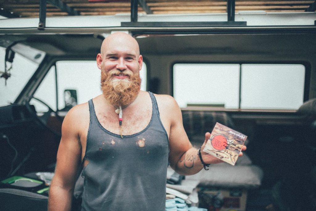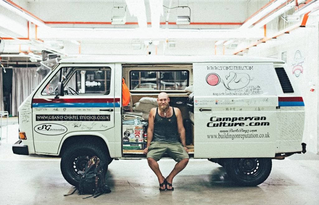 Tom feeling relieved he managed to pack all his gear into the van.